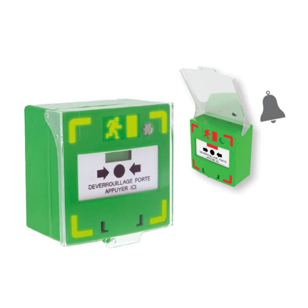 Un déclencheur manuel vert pour sortir par une porte est un dispositif de sécurité installé généralement à l’intérieur des bâtiments pour permettre aux personnes de sortir rapidement en cas d’urgence. Il est facilement identifiable grâce à sa couleur verte et à la mention « DEVEROUILLAGE PORTE » et « APPUYER ICI ».